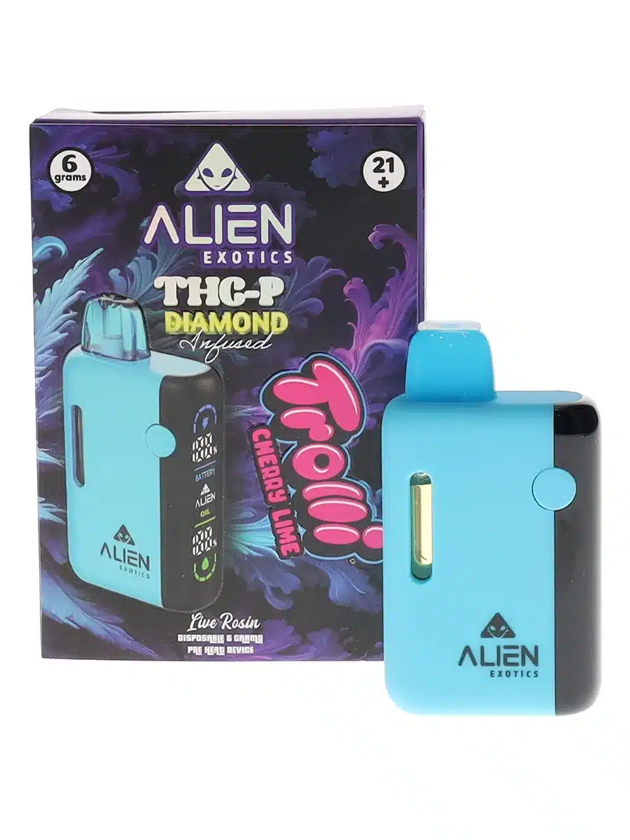 Discover a flavorful twist with the Trolli Cherry Lime Alien Exotics THC-P Diamond Infused Live Rosin Disposable 6G. This premium vape pairs ultra-potent THC-P diamond concentrate with live rosin extract, delivering a bold and refreshing cherry lime flavor. Perfect for those seeking balance, this hybrid blend offers uplifting and calming effects for a satisfying vaping experience.